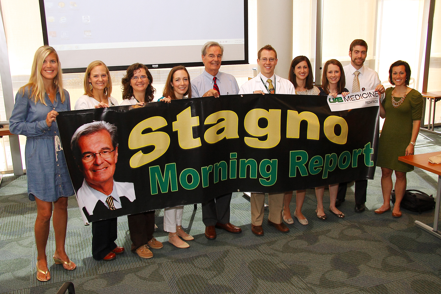 On June 18, 2014, the UAB Pediatrics Residency Program renamed Morning Report to Stagno Report in honor of Dr. Sergio Stagno for his dedication to the residency program and the education of residents. The Stagno Report takes place every morning at 7:55 in the Bradley Lecture Center. Cases are generally presented by upper level residents and led by the chief residents. Residents on PHM, subspecialty rotations, PICU, NICU, and emergency medicine present on a rotating basis, discussing a wide variety of cases. In addition we have longitudinal general outpatient pediatrics, social determinants of health, ethics, and global health discussions as well. The Stagno Report is always well attended by residents, medical students, fellows, and attendings alike. It is interactive with resident and attending participation concerning the history, physical exam, differential diagnosis, and management of the day’s case presentation. Because of these aspects, an engaging discussion takes place every morning, with multiple learning points.