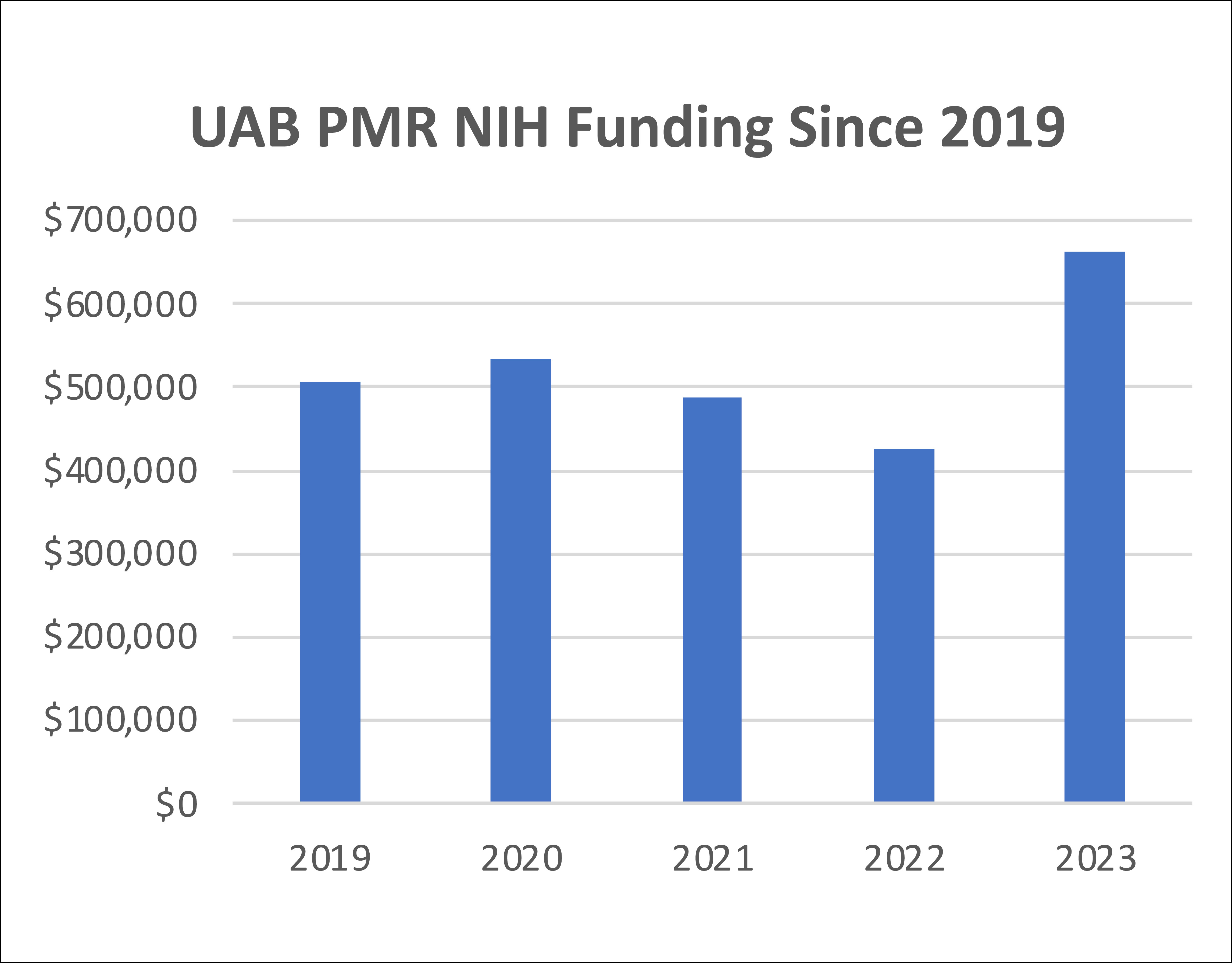 The Blue Ridge Institute for Medical Research has announced its annual rankings in National Institutes of Health (NIH) funding among Schools of Medicine along with funding by discipline for individual departments. In the latest 2023 report, the University of Alabama at Birmingham (UAB) Department of Physical Medicine and Rehabilitation (PM&R) ranks No.23 nationally among Departments of Physical Medicine and sees an increase in annual funding. -