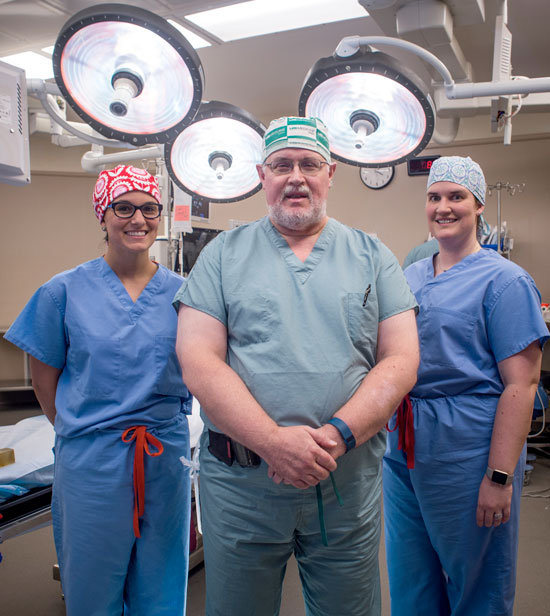 Dr. Margaux Mustian, left, and Dr. Laura Hickman, right, say they pursued a career in transplant surgery in part due to the teaching and training they received from longtime UAB transplant surgeon Dr. Mark Deierhoi, center.