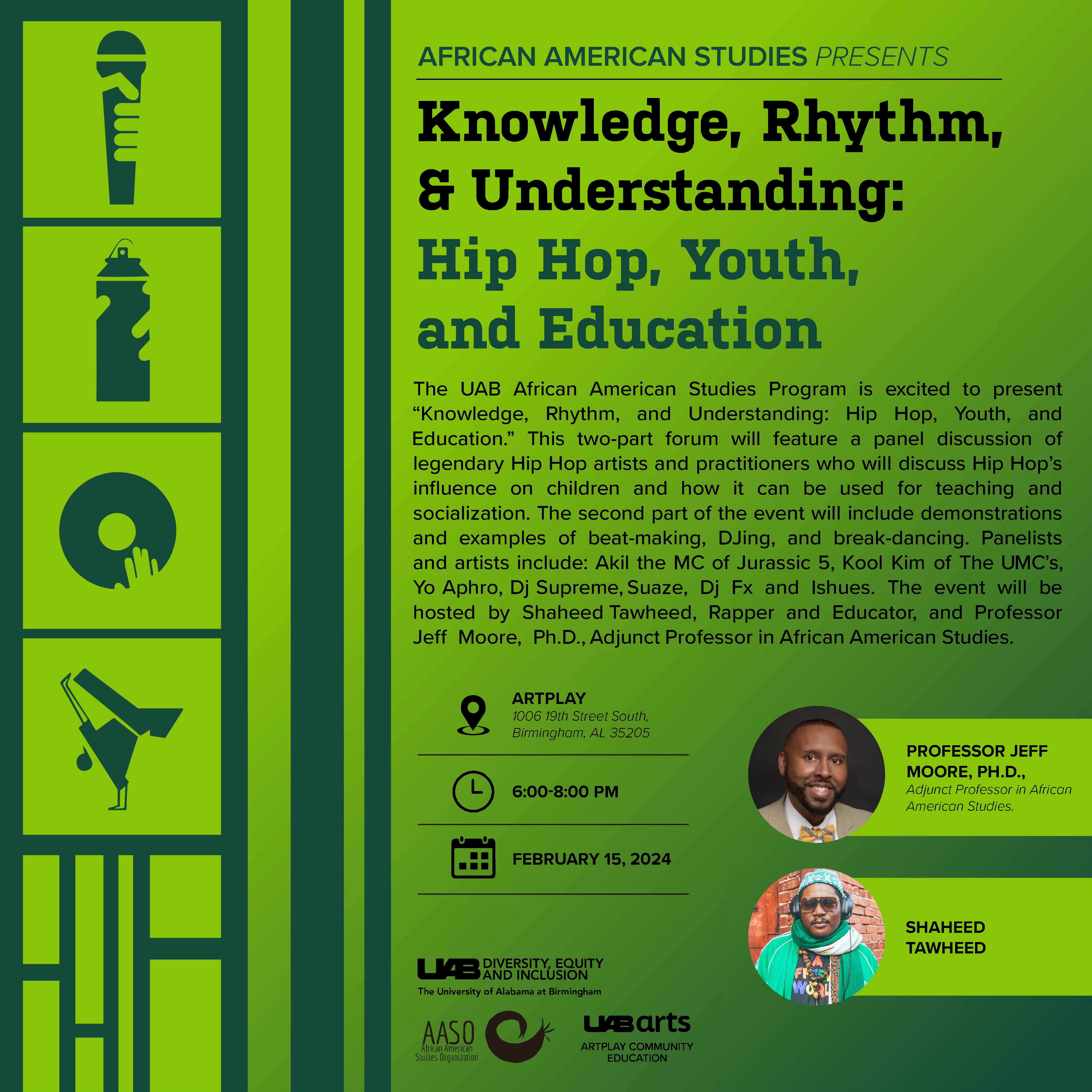 Learn about hip-hop culture and how it has shaped Black history at the University of Alabama at Birmingham’s “Knowledge, Rhythm and Understanding: Hip Hop, Youth and Education,” on Thursday, Feb. 15, from 6-8 p.m. at ArtPlay’s Johnson House, presented by the African American Studies Program in the College of Arts and Sciences.
