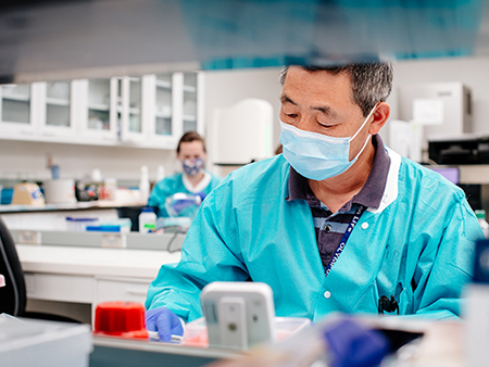 An unidentified Asian man is wearing a PPE (Personal Protective Equipment) face mask and gown while working in the UAB Genomic Diagnostics Laboratory (GDL), located in the West Pavilion, during the COVID-19 (Coronavirus Disease) pandemic, April 2021.Collective strength of the research enterprise leads to almost $648 million in research grants and awards for FY 2021.In spite of the pandemic and in part because of it, the University of Alabama at Birmingham extended its most successful era of research funding in FY 2021.