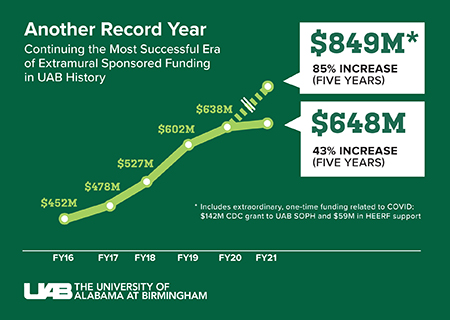 UAB received nearly $849 million in research grants and extramural awards for the 12-month period ending Sept. 30, 2021, up from almost $638 million the previous year, according to data from its Office of Sponsored Programs. The additional $211 million, which represents an extraordinary one-year increase of 33%, includes two pandemic-related awards totaling $201 million.