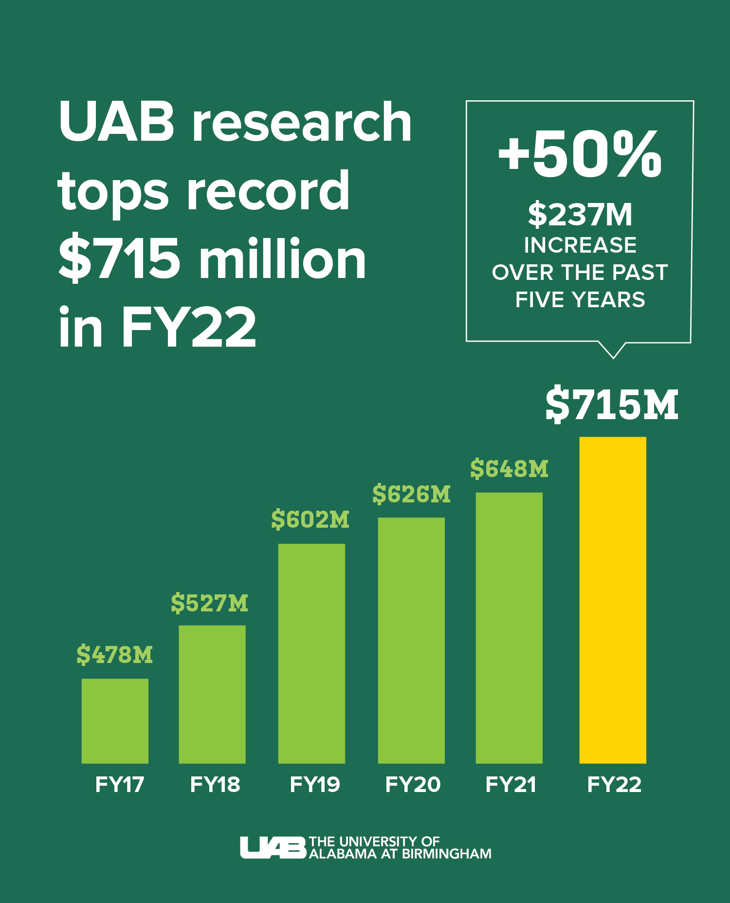UAB received more than $715 million in research grants and extramural awards for the 12-month period ending Sept. 30, 2022, up $67.8 million from the previous year, according to data from its Office of Sponsored Programs. That figure represents a 10.5 percent increase for the year and a nearly 50 percent increase — an additional $237 million — during the past five years.