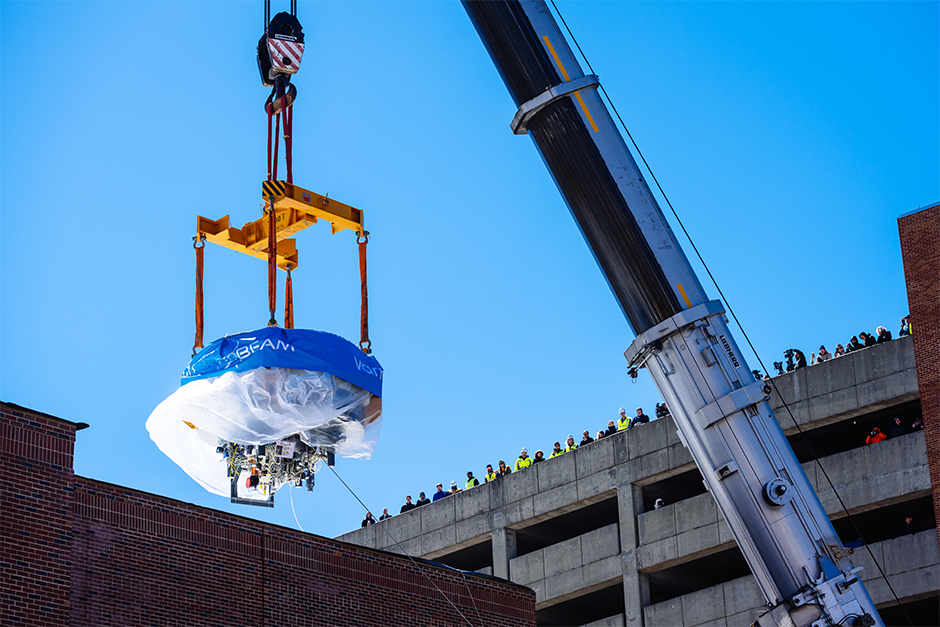 | Click here to see a video of Emma, the 90 ton cyclotron, as she arrived at UAB and was lowered into the building through the roof in March, 2019. |