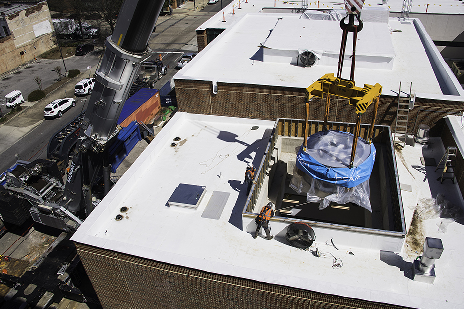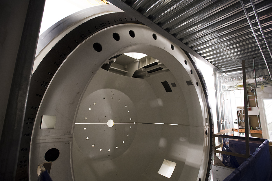 The heart of proton therapy is a machine called a cyclotron, which produces the proton beam and delivers it to the precise location in the body to destroy tumor cells. Proton International at UAB’s cyclotron, nick-named Emma, was manufactured in Germany. The $25 million, 90-ton cyclotron was brought by ship to Brunswick, Georgia, then transported to UAB last March by a specialized truck, with 20 axles, 78 wheels, and drivers in front and back. A heavy-lift crane was assembled on Fourth Avenue South to lift and deposit Emma into the facility via the roof.