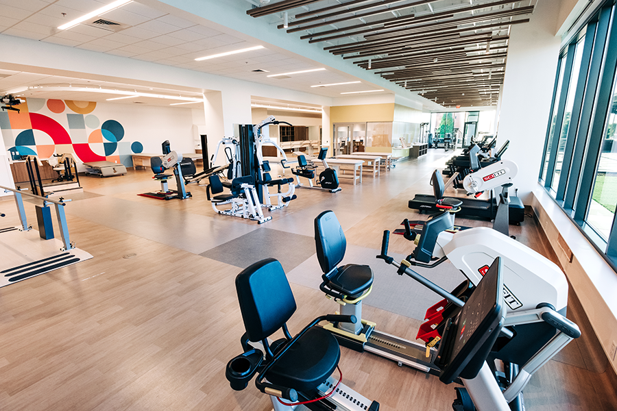 The state-of-the-art rehabilitation area has a low-impact water treadmill and zero G gait system.