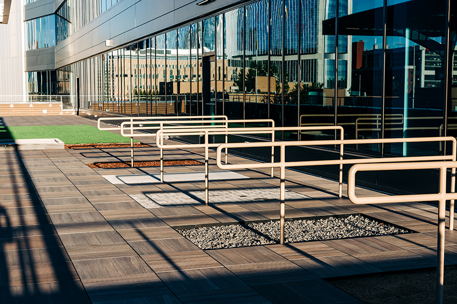 The state-of-the-art rehabilitation area has an outdoor patio with multiple surfaces for patients to practice navigating everyday challenges.