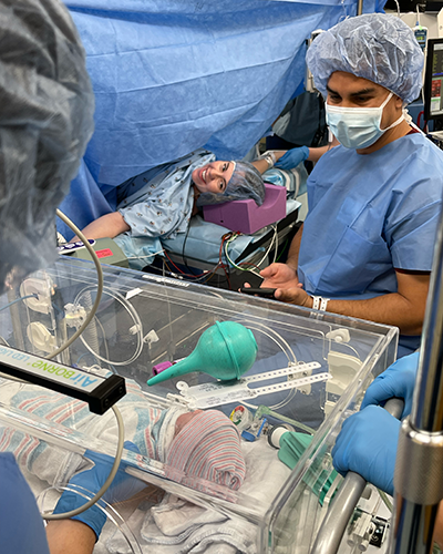 On Oct. 25, 2022, Lydia and Lynlee Alba were delivered at 32 weeks’ gestation via cesarean section. Photography courtesy of Britney AlbaAlba was admitted at 25 weeks and spent over 50 days in the HRO unit. During her stay, Alba was attended by a multidisciplinary team of maternal-fetal specialists, high-risk obstetrics nurses and neonatologists. The team conducted ongoing prenatal care, including fetal monitoring several times a day to ensure the twins remained well. Given the rarity of her pregnancy, Alba was also visited by medical students, residents and fellows.