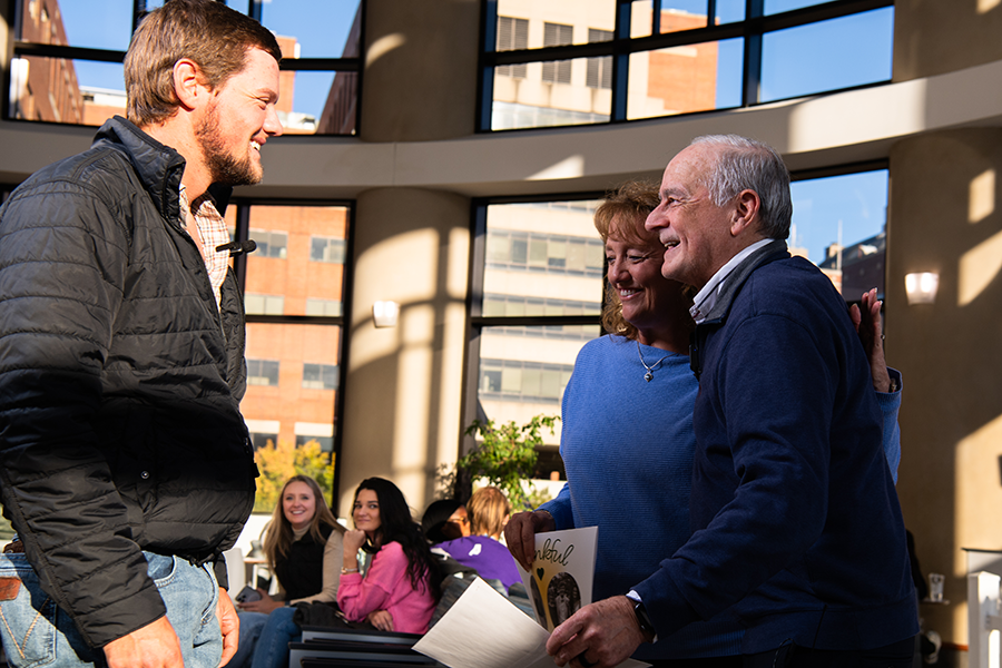 Wally Carlo, M.D., smiles as he is surprised by John and Ellen Emfinger.