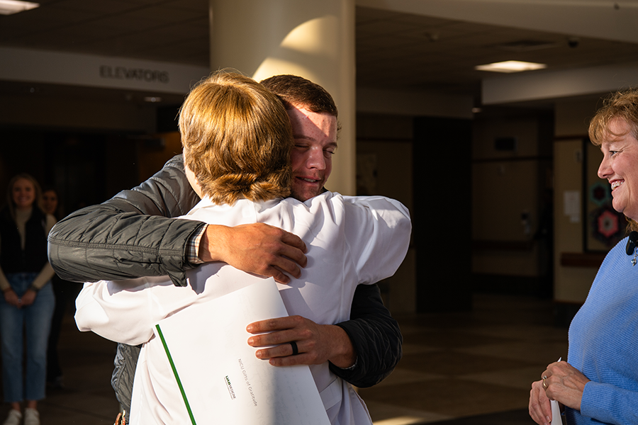 John Emfinger embraces Cynthia Brumfield, M.D., who delivered him in 2002.