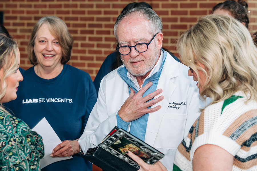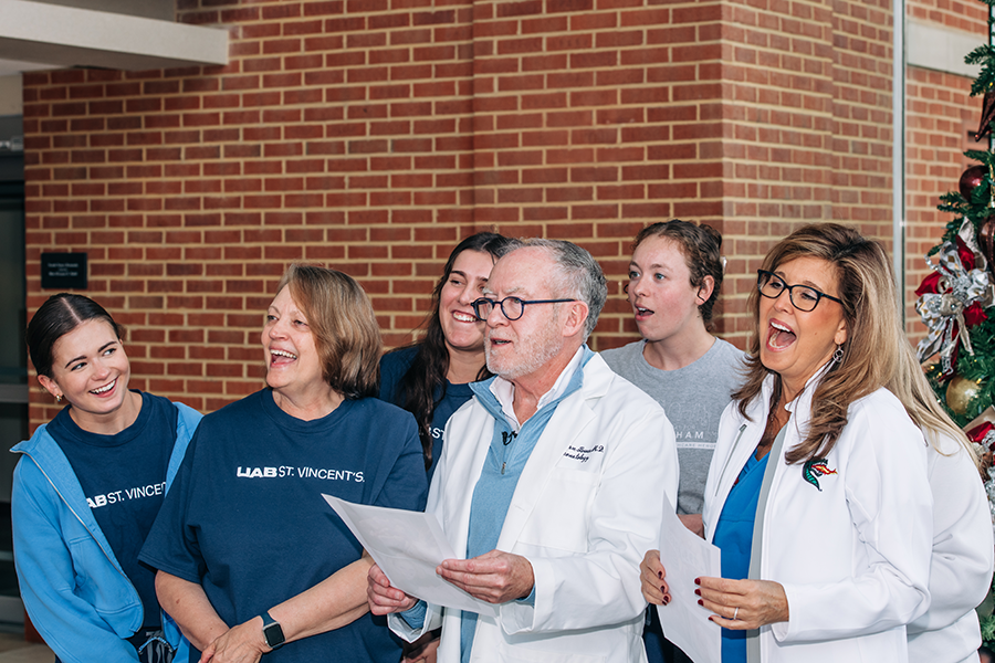 Photography: Ian LogueThe family surprised Dean Bruce, M.D., neonatologist and NICU medical director, and nurses Lisa Costa and Tammy Hall from their care team at UAB St. Vincent’s.