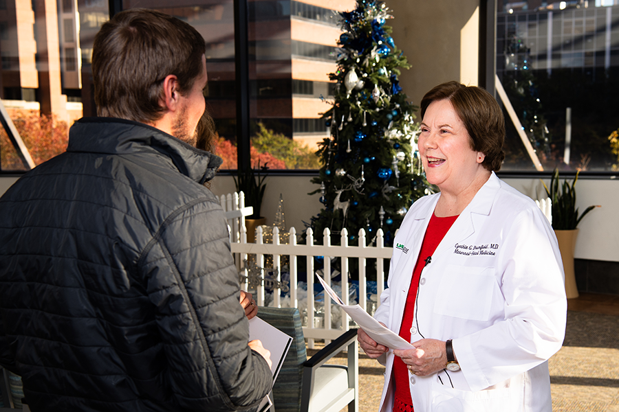 Cynthia Brumfield, M.D., retired UAB maternal-fetal medicine physician, chats with John Emfinger.