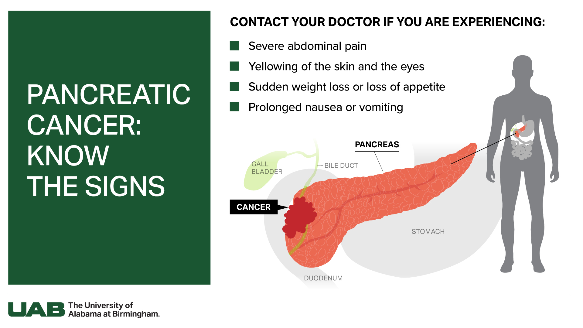 This year, approximately 1,000 Alabama residents will be diagnosed with pancreatic cancer. With a trending increase in cases for patients under the age of 55, experts at the University of Alabama at Birmingham Department of Surgery say it is important for individuals to familiarize themselves with common signs and symptoms associated with pancreatic cancer to reduce their risk and identify key indicators of the disease.