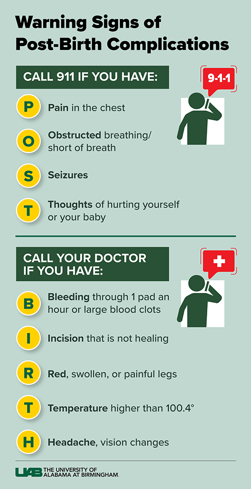 If someone in the postpartum period experiences any of the warning signs below, they should call their health care provider or 911 and inform them of their postpartum status. The acronym “POST BIRTH” is an easy way to remember these complications: