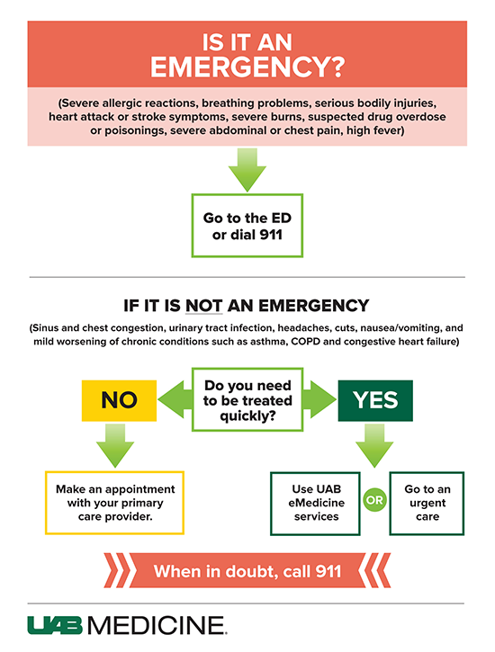 Fortunately, UAB Medicine offers several alternative care options for patients with conditions or illnesses that, while serious, may not require the services of an emergency department. On top of that, physicians from the University of Alabama at Birmingham Marnix E. Heersink School of Medicine say there are steps people can take that may help them avoid the emergency department altogether.