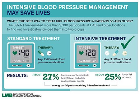 Final results of the UAB-led national study on high blood pressure confirm a target goal of less than 120 mm Hg reduces adverse eventsFollow-up data from the landmark SPRINT study of the effect of high blood pressure on cardiovascular disease has confirmed that aggressive blood pressure management — lowering systolic blood pressure to less than 120 mm Hg, dramatically reduces the risk of heart disease, stroke, and death from these diseases, as well as death from all causes, compared to lowering systolic blood pressure to less than 140 mm Hg. Systolic blood pressure is the upper number in the blood pressure measurement, 140/90, for example.