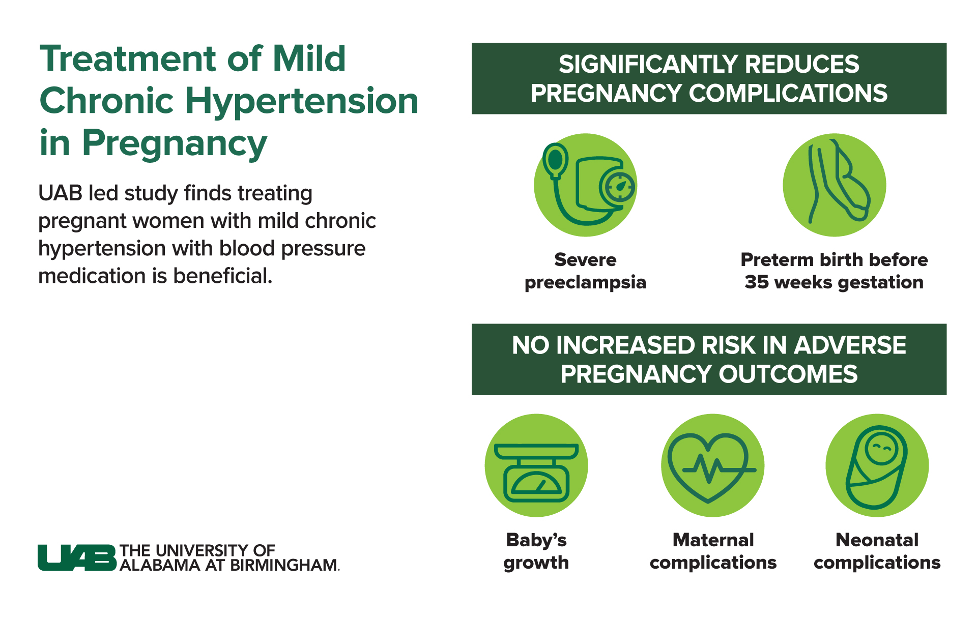 The results are from the Chronic Hypertension and Pregnancy trial, or CHAP, consortium of more than 60 clinical sites across the United States that was led by the University of Alabama at Birmingham. The trial evaluated the effects of prescribing blood pressure medication to pregnant women with mild chronic hypertension. The study results showed this treatment improved pregnancy outcomes without compromising the baby’s growth and overall health, which has been a primary concern from physicians for years.