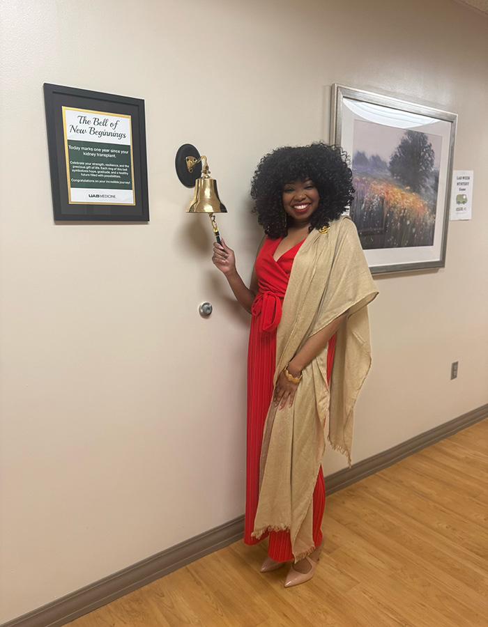 Bell of New Beginnings rings out for life 02For years, Jackson’s care routine consisted of multiple hospital visits, checkups, lab tests, and progress reports with her endocrinologist, nephrologist and other clinicians.When kidney transplant patients at the University of Alabama at Birmingham Comprehensive Transplant Institute celebrate their first year after transplant, they ring a bell. The bright tone of the “Bell of New Beginnings” resonates throughout the clinic, marking the first anniversary of a journey toward a new chance at life.