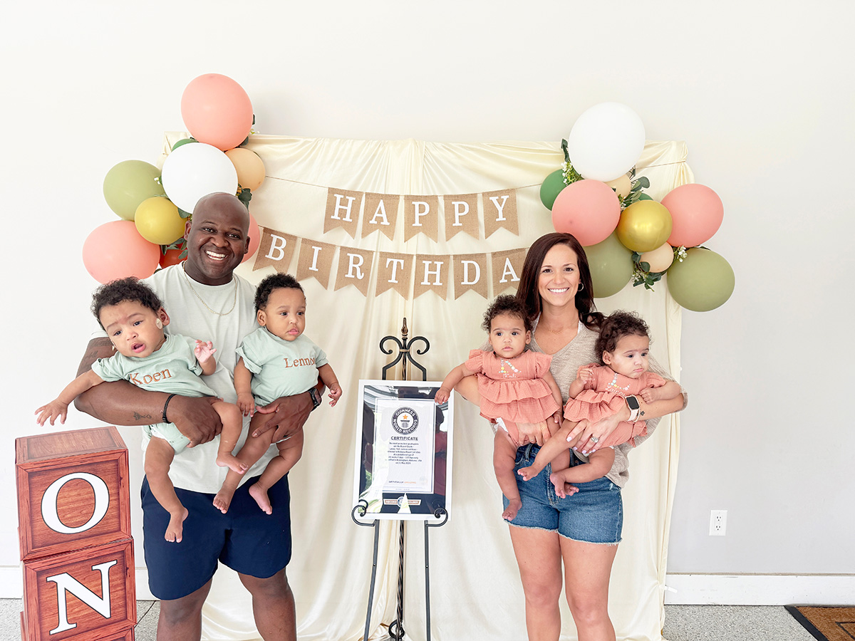 Sanusi joins the Bryant family to celebrate the quads’ first birthday. L to R: Lavareis holds Koen, Sanusi holds Lennon, Becca holds Kali and Lainey. Photography provided by Becca Bryant