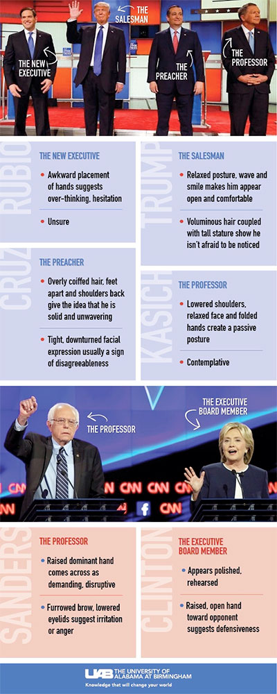Mark Hickson, Ph.D., professor of communication studies at the University of Alabama at Birmingham, is an expert in nonverbal communication. Ahead of tonight’s Univision Democratic primary debate and Thursday’s CNN Republican debate, Hickson provides an analysis of each candidate’s nonverbal behaviors during the Republican debate held March 3 and the Democratic debate March 6.