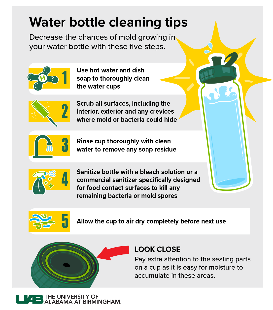 “Mold spores, which are ubiquitous in the environment, can settle on damp surfaces and begin to grow,” said Benjamin Turner, instructor in the University of Alabama at Birmingham’s Department of Biology. “Additionally, if the water inside the bottle is not replaced regularly, organic matter from saliva or other contaminants can provide nutrients for mold to thrive.”
