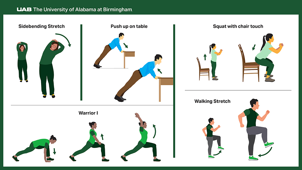 Brian Riddle, DPT, director of Physical Therapy for UAB Sports and Exercise Medicine, says there are many exercises that can be done safely in an office or at a desk. Some recommendations include: