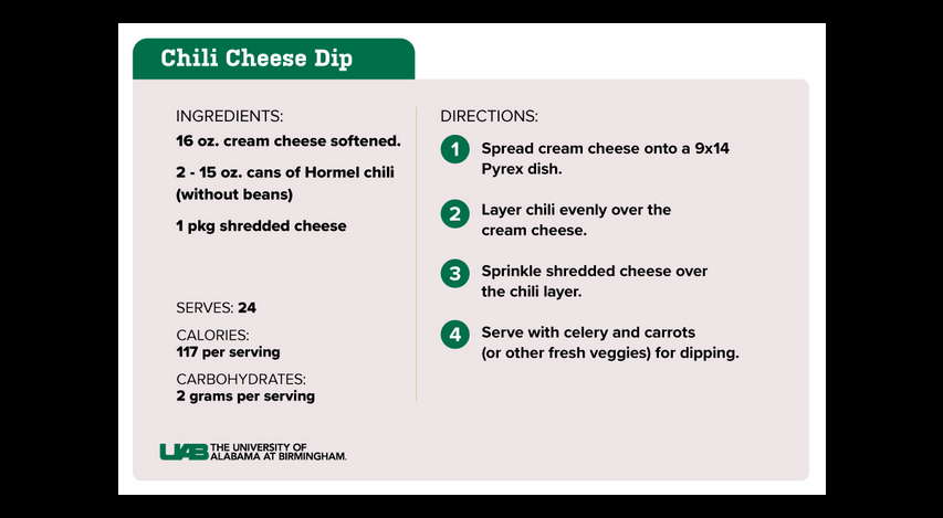 Amy Goss, Ph.D., assistant professor in the UAB Department of Nutrition Sciences, provides four diabetes-friendly tailgating recipes. All recipes have five or fewer ingredients and should not cause a sharp rise in blood glucose.