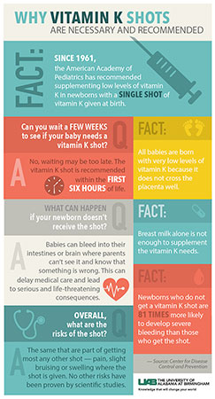 Avoiding the shots, which are given to prevent internal bleeding in the brain and intestines, can result in dire consequences for newborns, says DeeAnne Jackson, M.D., medical director of the UAB Hospital Newborn Nursery and associate professor in the School of Medicine.