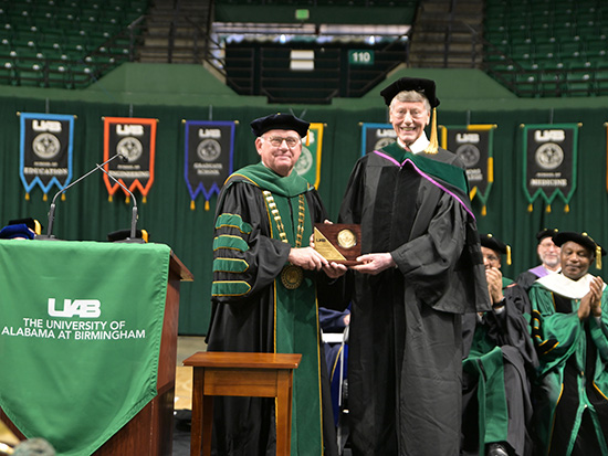 UAB President Ray L. Watts, M.D., presenting the President’s Medal to Marnix E. Heersink, M.D.The University of Alabama at Birmingham presented the 2024 President’s Medal to Marnix E. Heersink, M.D., during the graduate commencement ceremony Saturday, Dec. 14. The President’s Medal recognizes Heersink’s exemplary service to UAB.