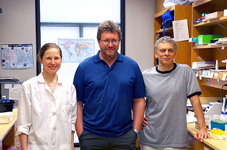 Left to right, Katarina Akhmetova, Igor Chesnokov and Maxim Balasov“This hybrid approach,” Chesnokov said, “allows the study of human protein functions in an animal system, and it revealed the importance of evolutionary conserved and variable domains of the Orc6 protein. We believe that this hybrid approach not only opens a broad avenue to study new Orc6 mutations for medical and general science purposes, but also might be useful in other humanized models.”