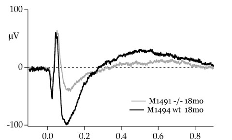 This electroretinogram image shows photoreceptor activity from two mice. The gray line represents the animal model that has frontotemporal dementia, the black line is the control or healthy mouse. The large negative spike in the diagram indicates a reduction of ganglion cells in the retina of the mouse model that mirrors human dementia.Roberson’s laboratory has been studying an animal model for FTD. Using a process called ERG, or electroretinogram — similar to an EKG — Roberson and Kraft showed that the retinas in mice with FTD had a loss of ganglion cell function; these cells are responsible for transmitting signals from eye to brain. That data, along with additional ERG studies that Kraft performed in California, aligned well with comparable human studies conducted by Gladstone and UCSF.