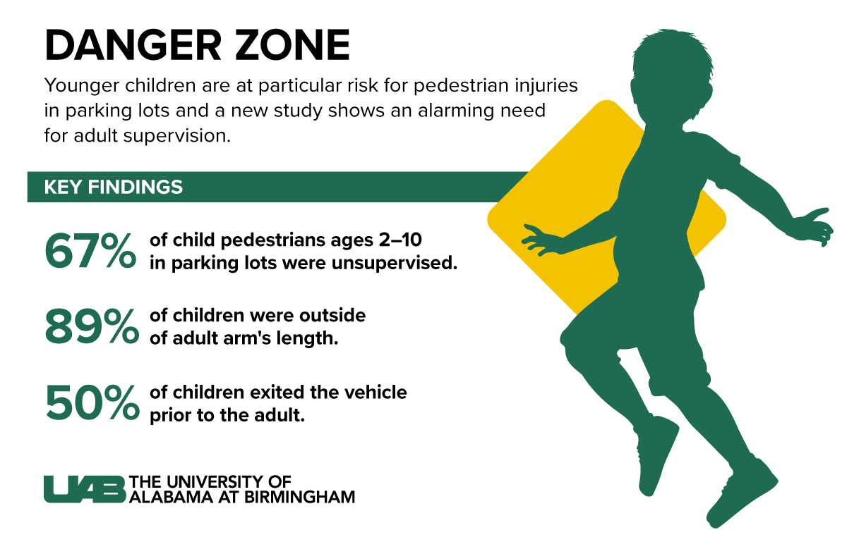 A new study from the University of Alabama at Birmingham shows an alarming need for adult supervision in parking lots, with 67 percent of children observed not having supervision at some point between the vehicle’s parking and the child’s entering the building.