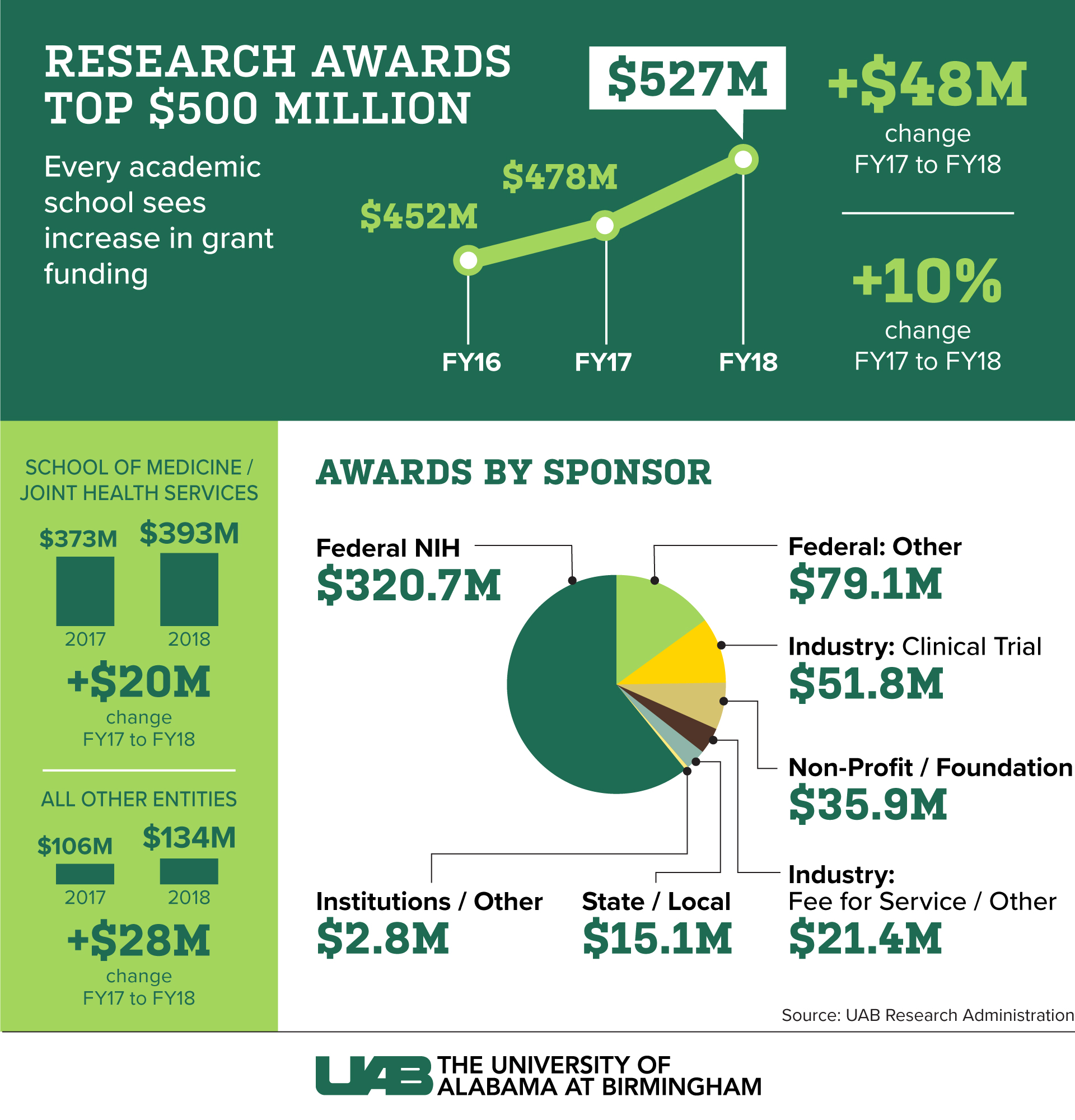 The School of Medicine and the Joint Health Sciences funding was up $20 million from last year, which was a 5.4 percent increase. Meanwhile, all other UAB entities combined to increase their award funding by $28 million, or 26.4 percent.