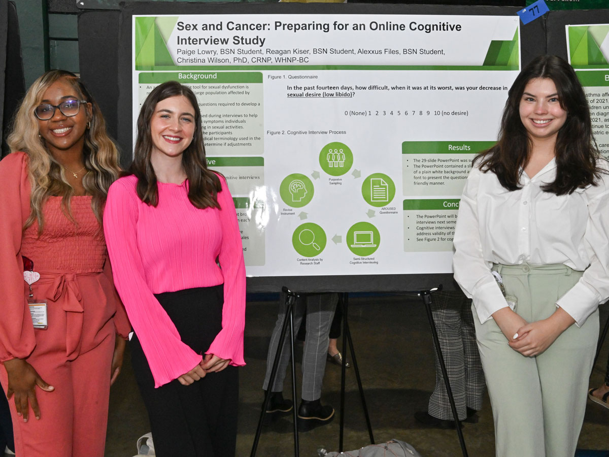 BSN students Alexxus Files, Paige Lowry and Regan Kiser stand in front of their poster during the UAB Undergraduate Research Expo.