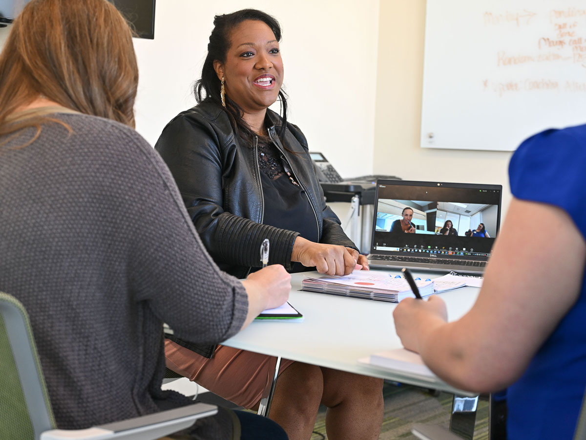 Dr. Shena Gazaway discusses a giant during a team meeting.