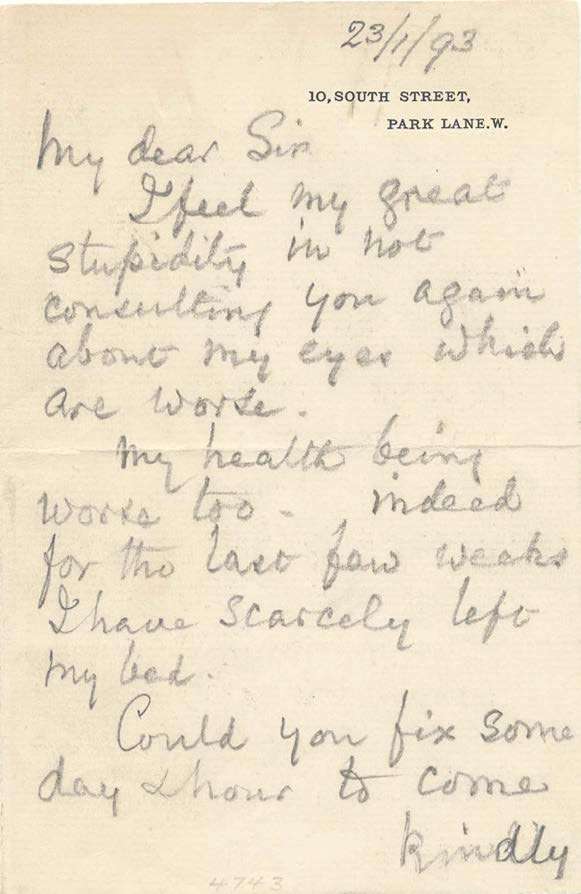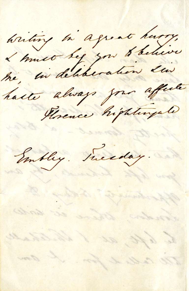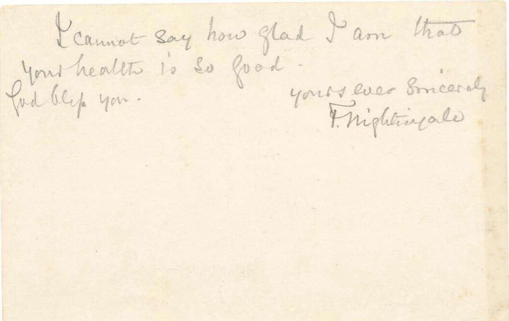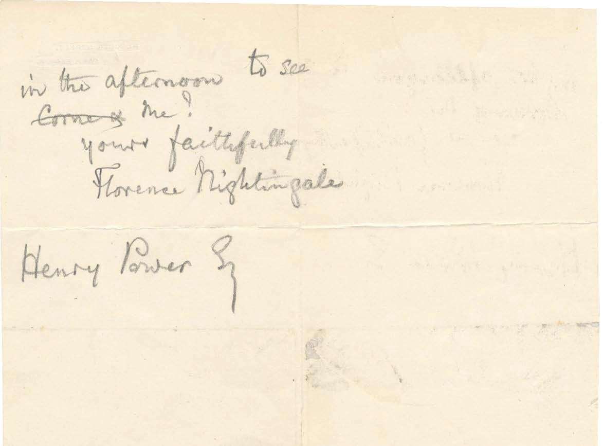 Description: In this letter, Nightingale is asking her doctor, Henry Power, to visit her about the worsening condition of her eyes and general health.