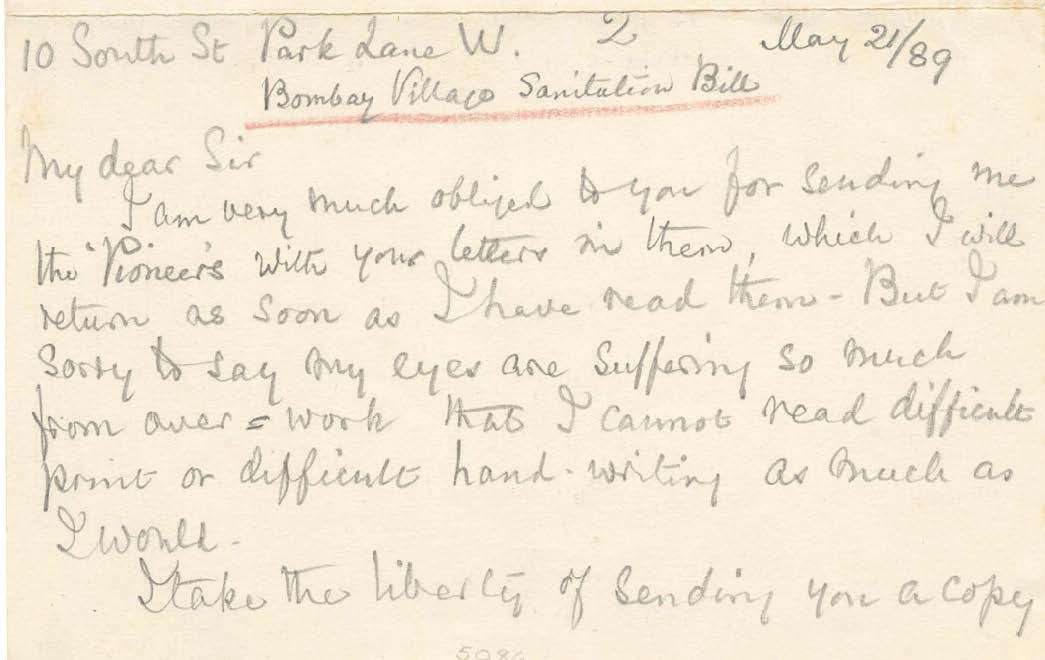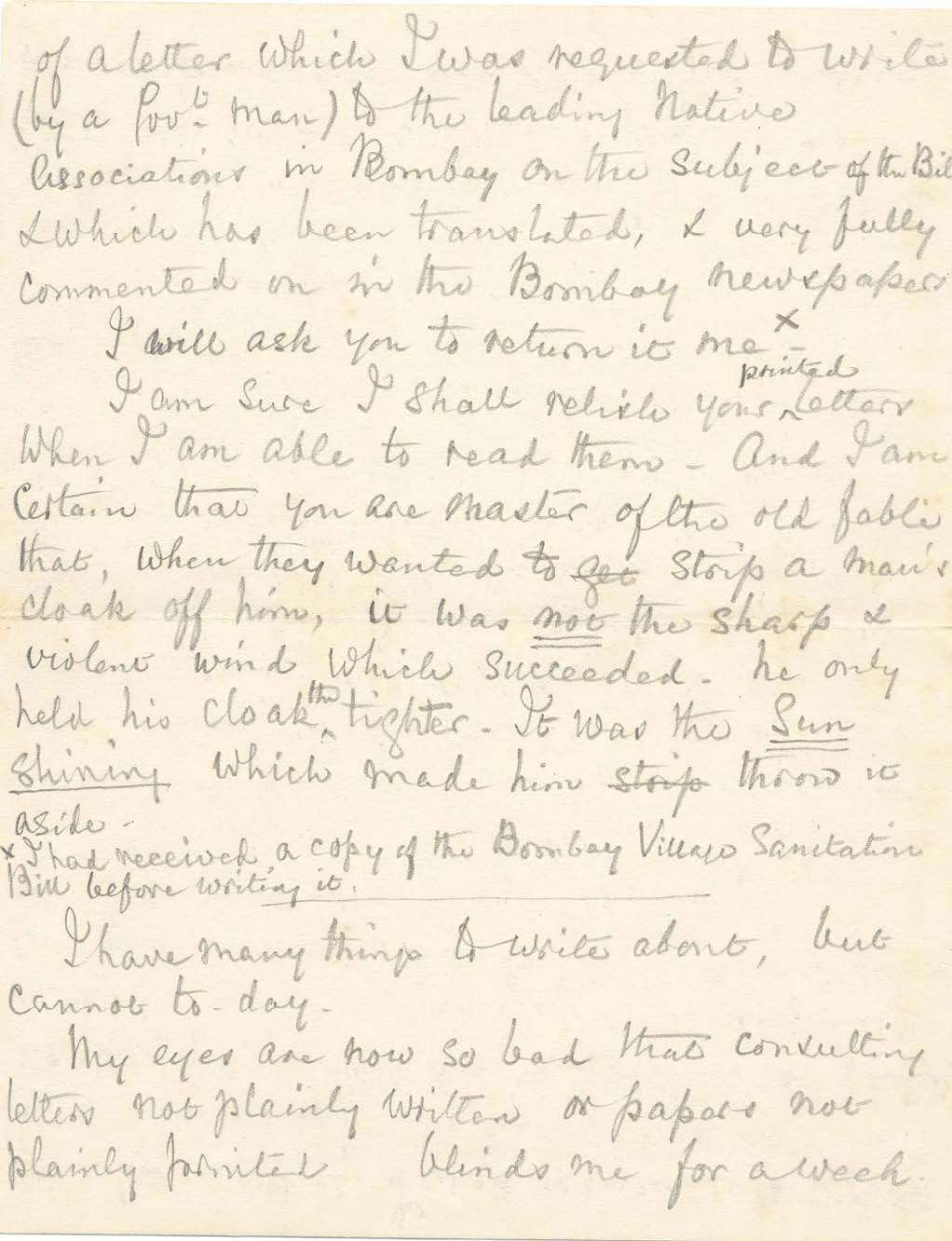Description: Nightingale explains to an unknown recipient that she is forwarding a letter she wrote to the native Indian associations concerning the Bombay Village Sanitation Bill. She also mentions problems with her eyes.