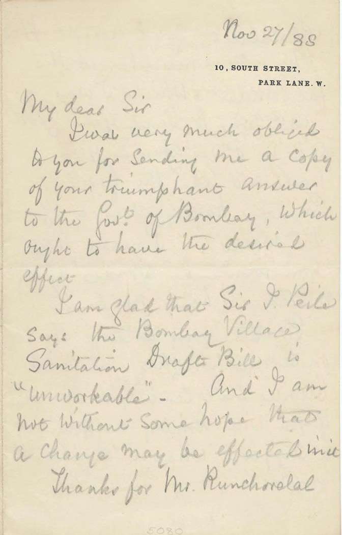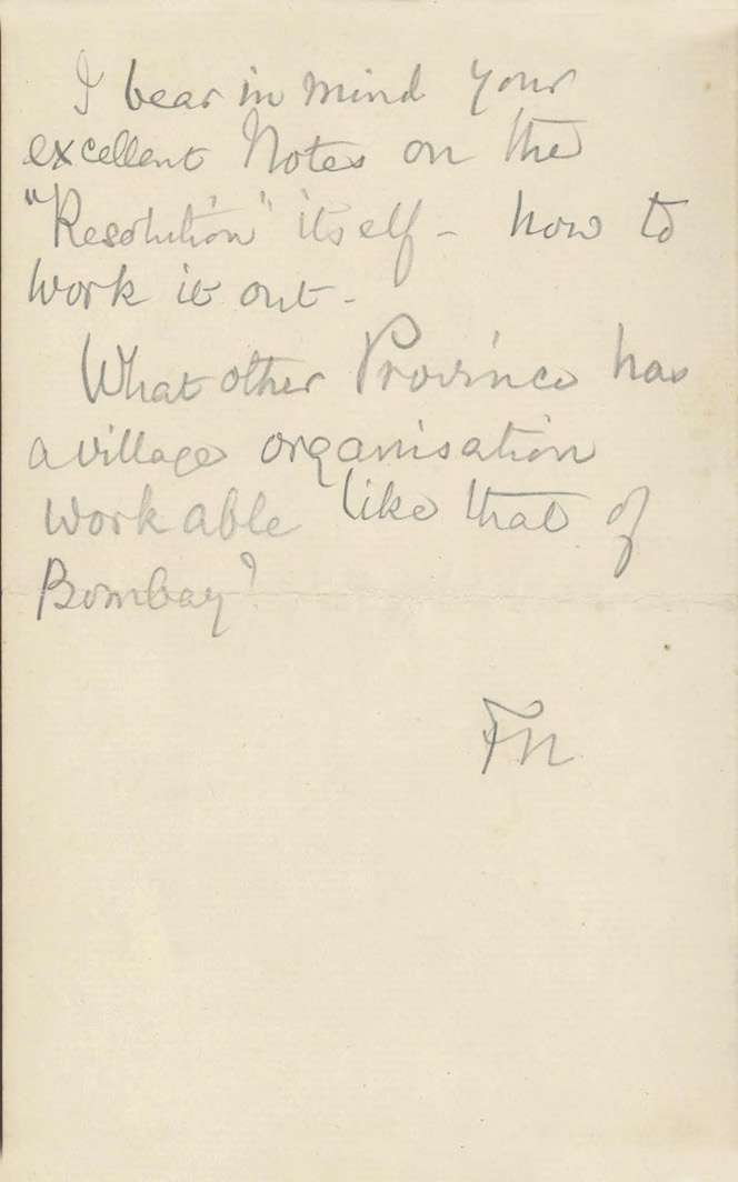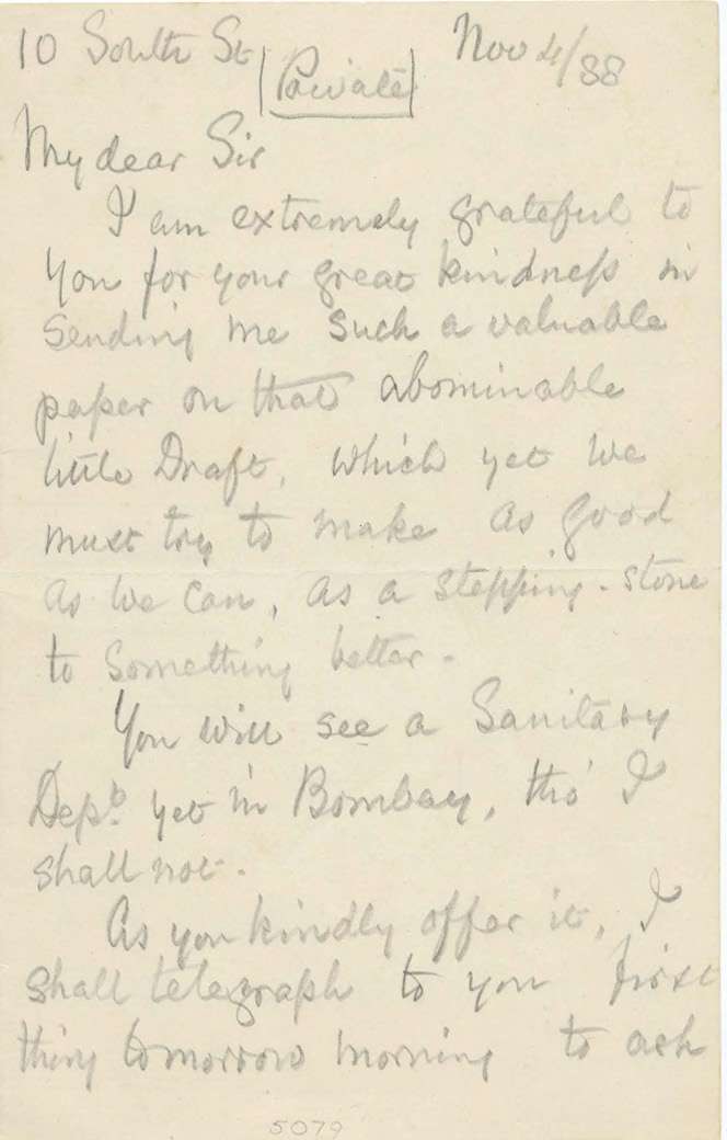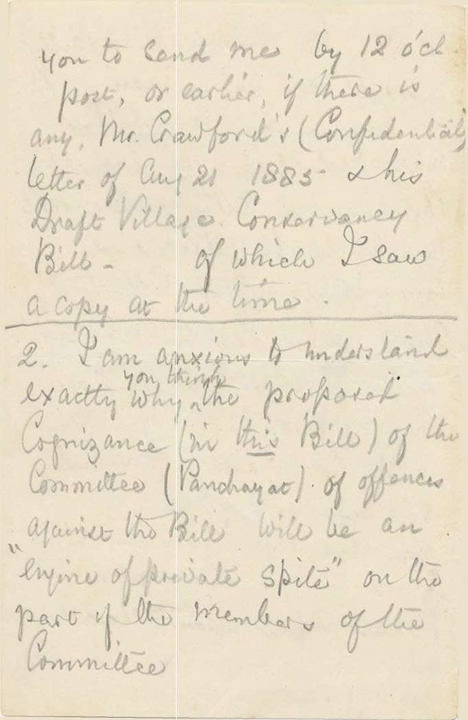 You will see a Sanitary Dept yet in Bombay, tho' I shall not. As you kindly offer it, I shall telegraph to you first thing tomorrow morning to ask you to send me by 12 o'cl. post, or earlier, if there is any, Mr. Crawford's (Confidential) letter of Aug 21 1885 & his Draft Village Conservancy Bill - of which I saw a copy at the time.