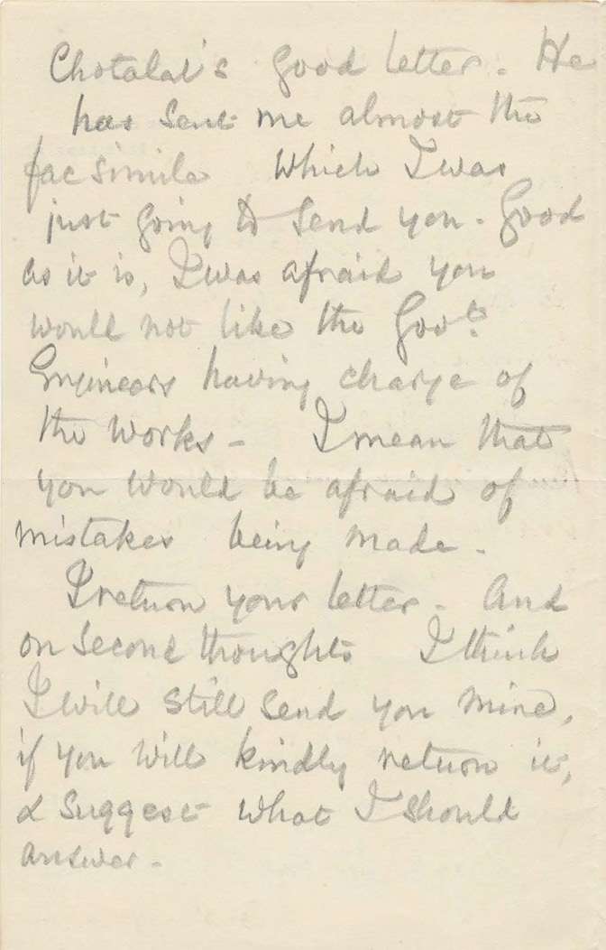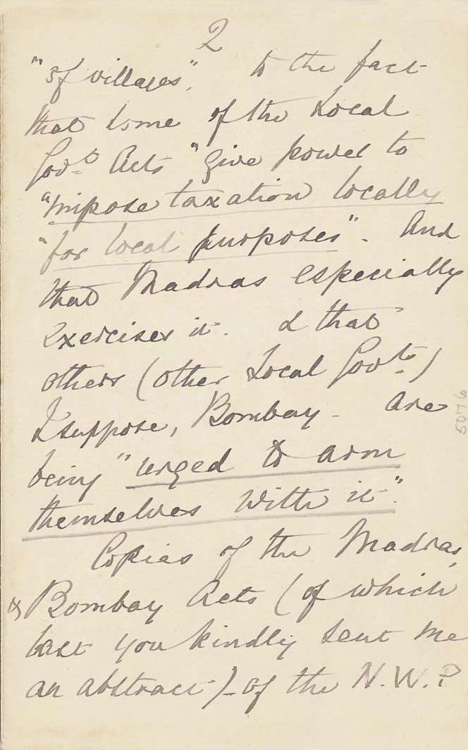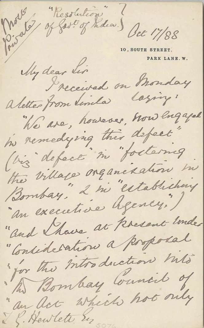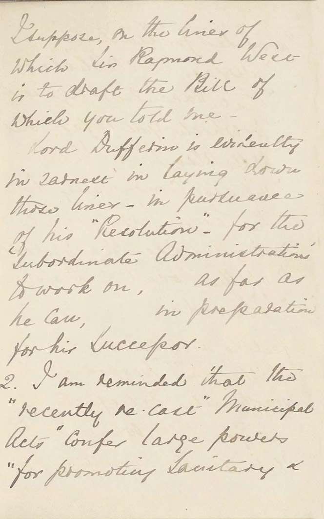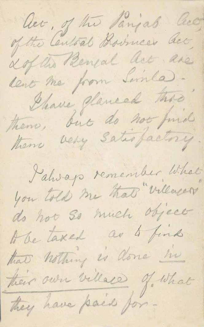 You will see a Sanitary Dept yet in Bombay, tho' I shall not. As you kindly offer it, I shall telegraph to you first thing tomorrow morning to ask you to send me by 12 o'cl. post, or earlier, if there is any, Mr. Crawford's (Confidential) letter of Aug 21 1885 & his Draft Village Conservancy Bill - of which I saw a copy at the time.