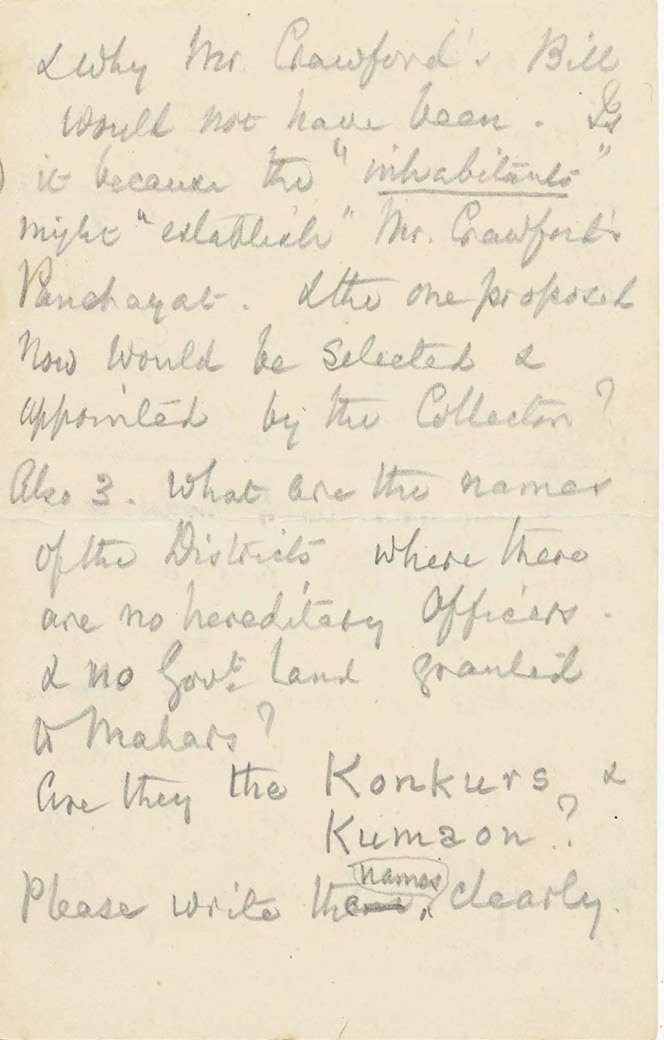 2. I am anxious to understand exactly why you think the proposed Cognizance (in this Bill) of the Committee (Panchayat) of offences against the Bill will be an "engine of private spite" on the part of the members of the Committee & why Mr. Crawford's Bill would not have been. Is it because the "inhabitants" might "establish" Mr. Crawford's Panchayat & the one proposed now would be selected & appointed by the Collection?