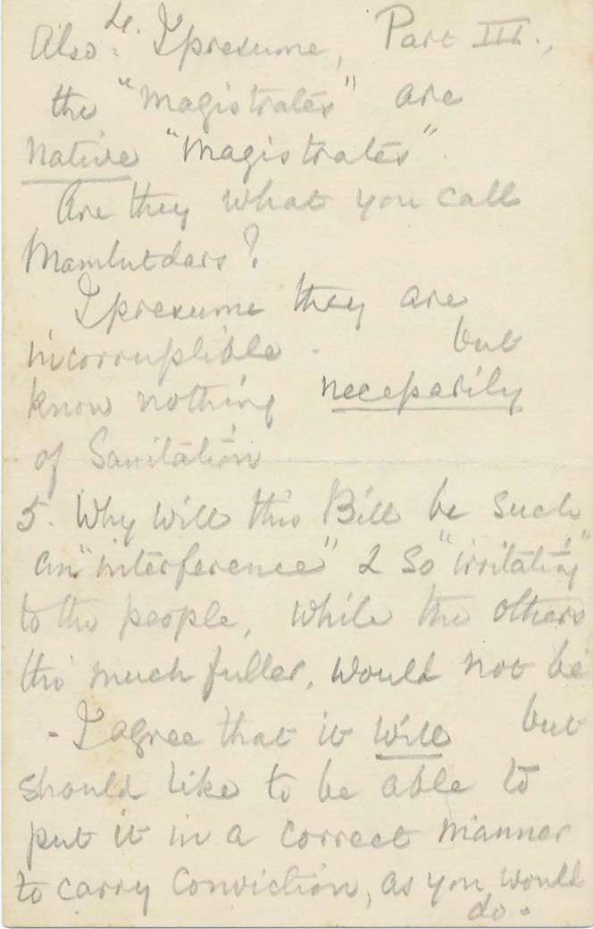 Also 4. I presume, Part III., the "magistrates" are native "magistrates." Are they what you call Mamlutdars? I presume they are incorruptible, but know nothing necessarily of Sanitation.