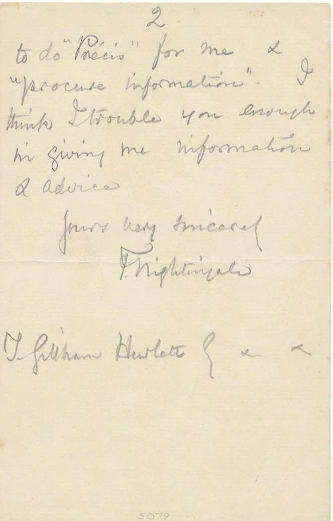 Description: Florence Nightingale writes to Mrs. James about patient admittance, payment, demographics and lengths of stay at the Institute for the Care of Sick Gentlewomen. Nightingale was superintendent at this institution for a year between her training in Germany and nursing in the Crimean War.