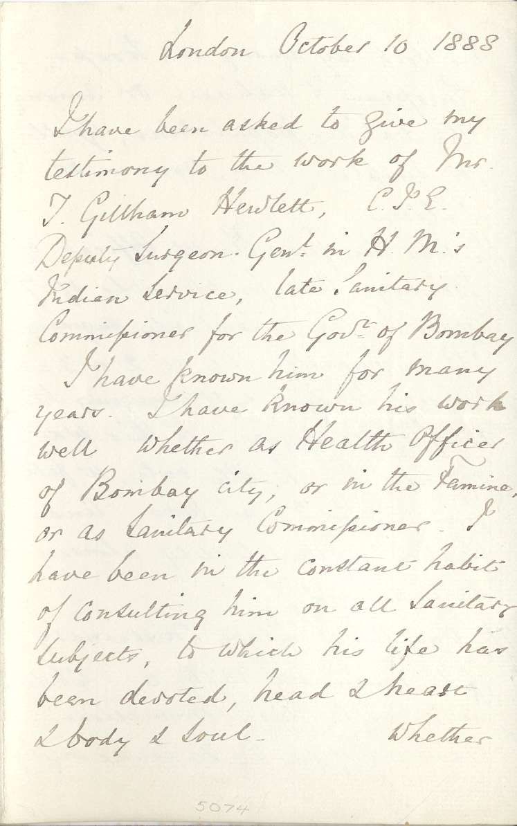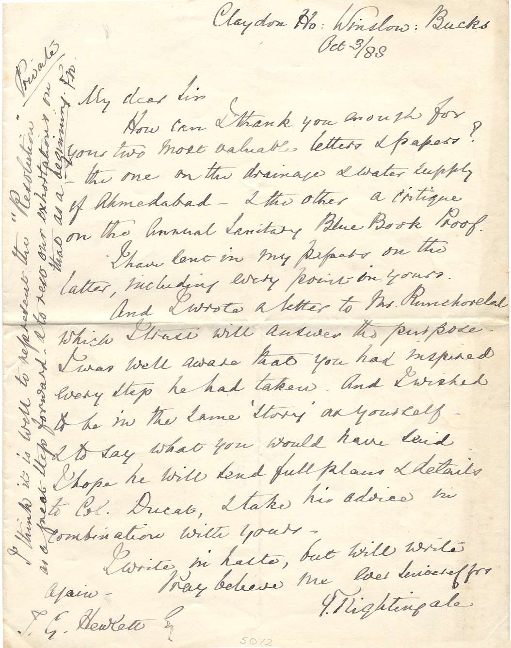 I feel like a criminal for not having answered your note before about your nephew, Mr. Hewlett's, truly magnificent work as Health Officer of Bombay. It is most instructive, full & graphic. The illustrations are a great addition, as it is always well to speak to people through their eyes. It is much better & more full of information than the Reports of Officers of Health in England usually are, as to what is to be done as well as what is to be observed. It is very good on the subjects to which it is especially devoted, namely nuisances resulting from bad management & want of sanitary works.