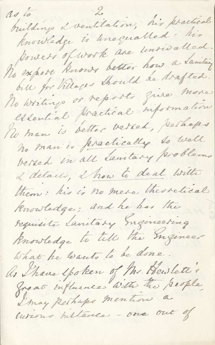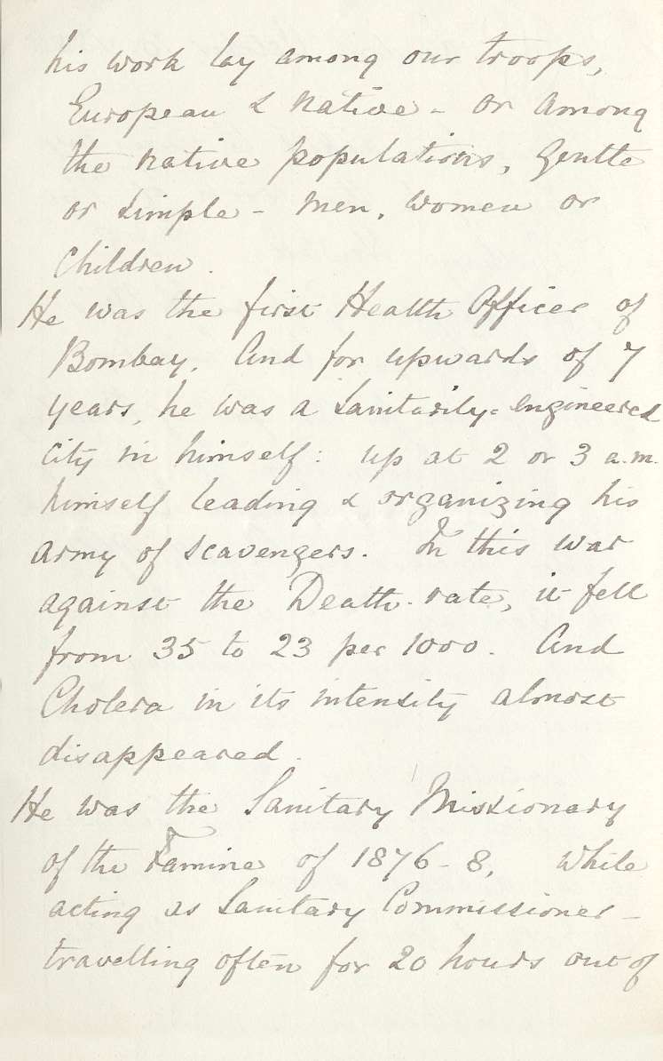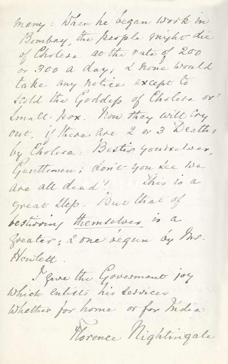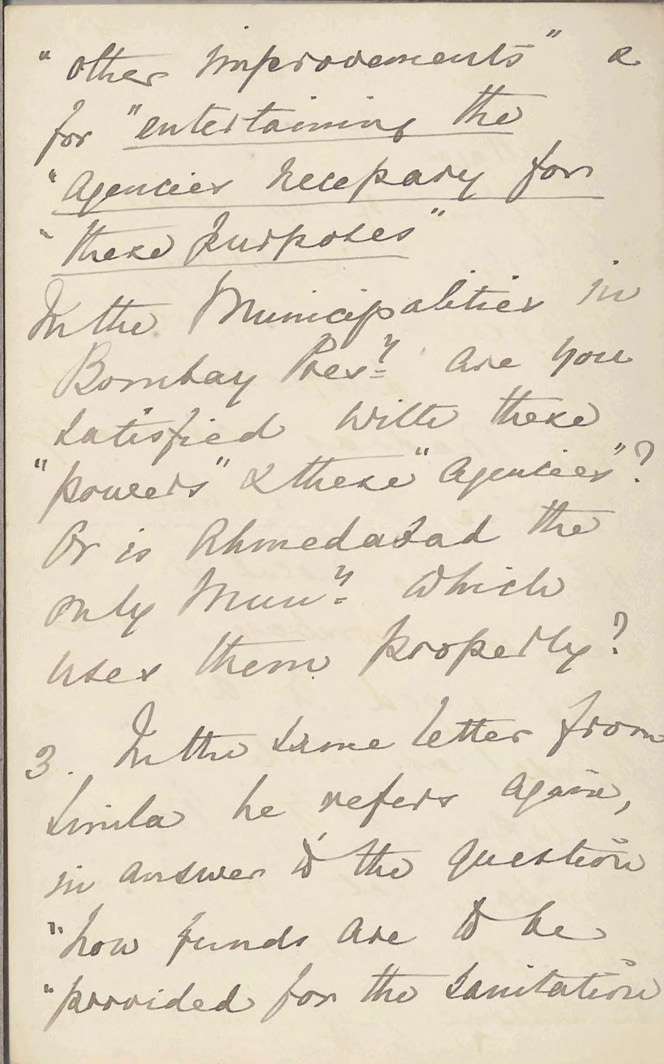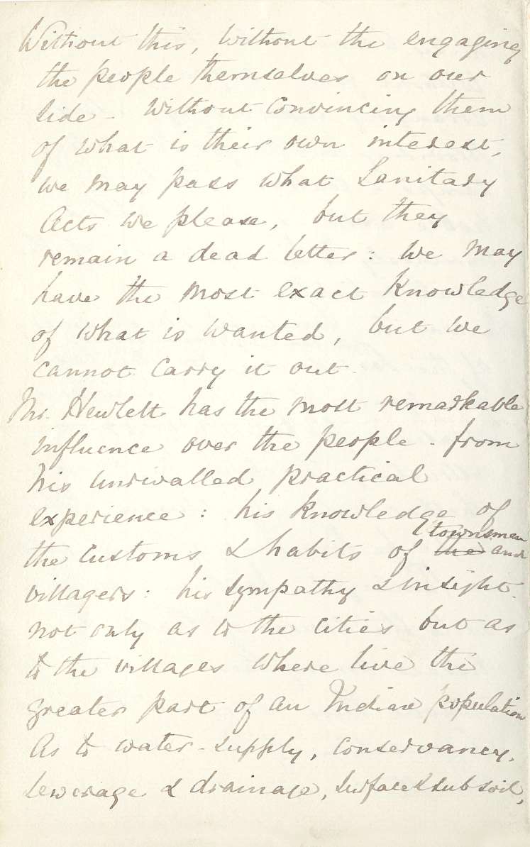 If you see your way to making this suggestion I should add, not as if it were a want in the Report, because, of course, as Health Officer he has reported completely, but as a suggestion as to how it should be followed up immediately; before we can know really what Bombay & other Indian cities require, we must have Engineering reports showing all the existing Engineering defects & the plans of water supply, sewerage, house drainage, & surface paving, improved streets, &c &c necessary to make the cities what they should be. We have sent minutes to this effect over & over again, not that European Health reports embody the Engineering points one bit more than Indian Health Reports do but that Sidney Herbert established a new principle in our Reportings which, had he lived, he certainly would have extended to India. He insisted upon the evils to be pointed out, the engineering remedies to be proposed, the constructive arrangements to be carried out, always appearing in the same Report.