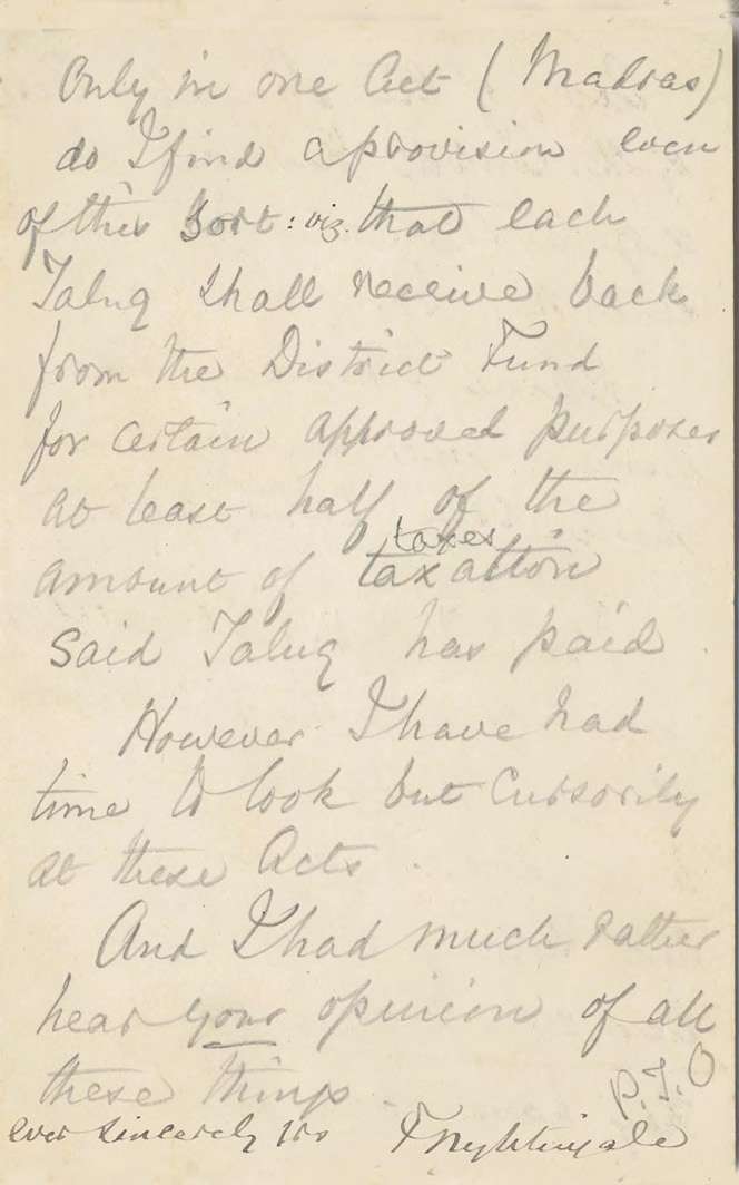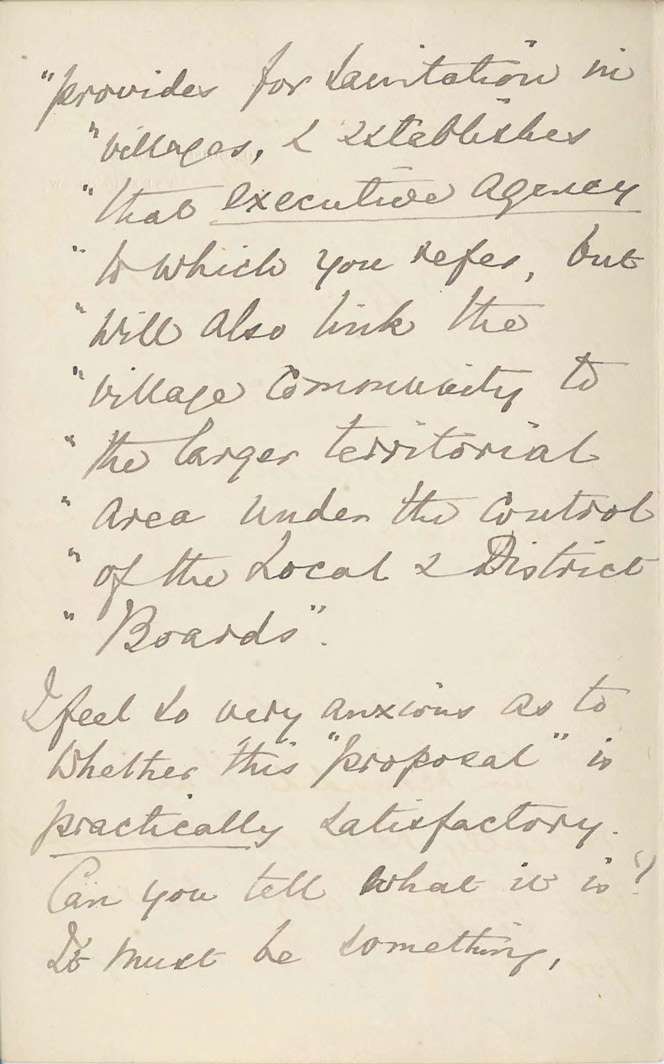 Description: Nightingale writes to T. G. Hewlett, Health Officer of Bombay, about a village conservancy bill that is in the drafting process. She questions him about the problems he sees with one of the drafts.