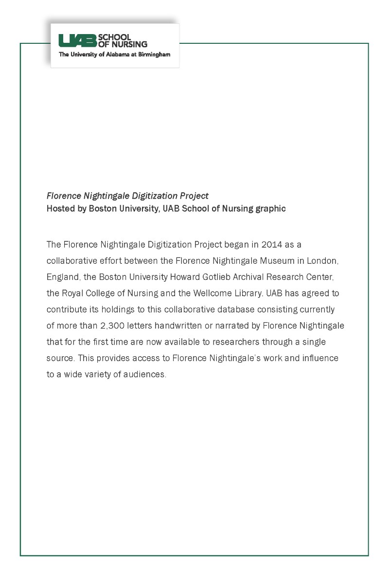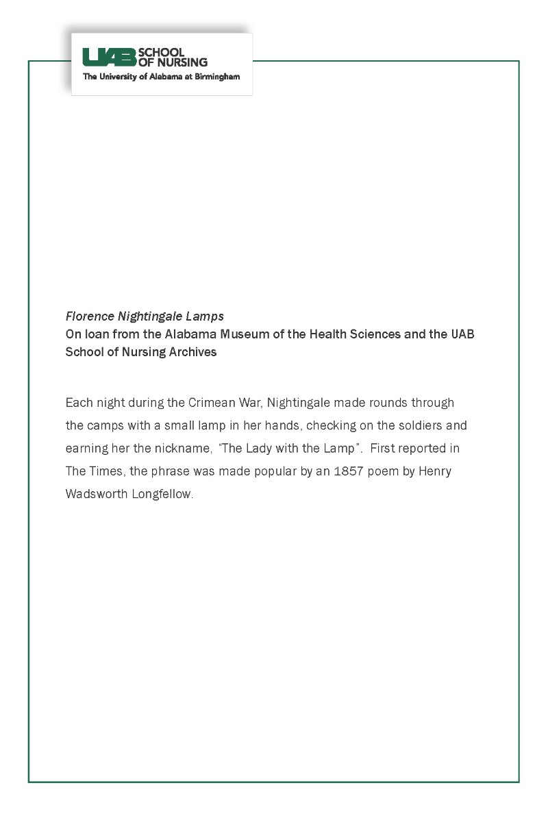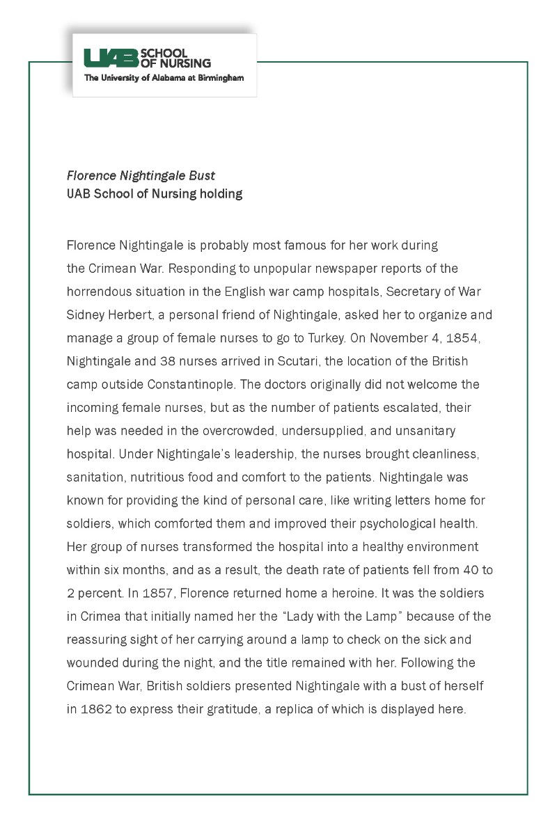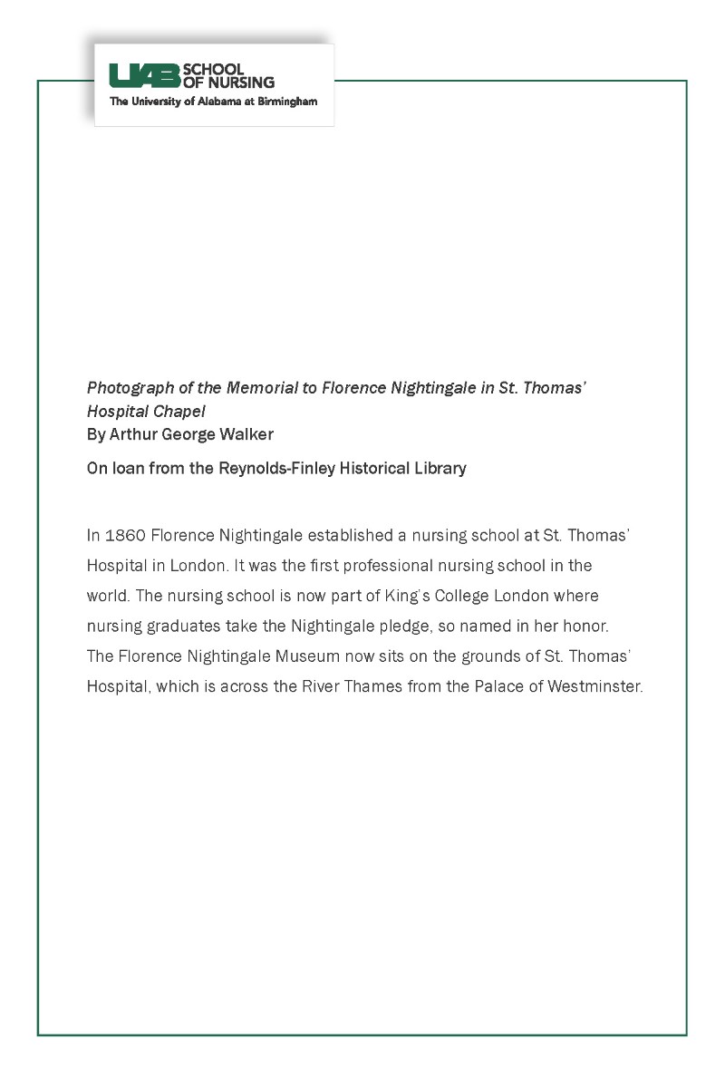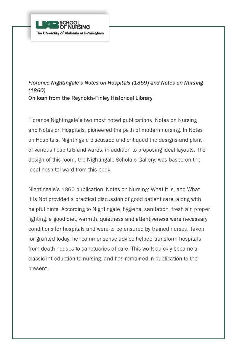 The Rick M. and Barrett Brock MacKay Nightingale Scholars Gallery, donated by Barrett and Rick MacKay and prominently located on the first floor of the School’s new building expansion, is designed to mimic Florence Nightingale’s “Ideal Hospital Ward”.