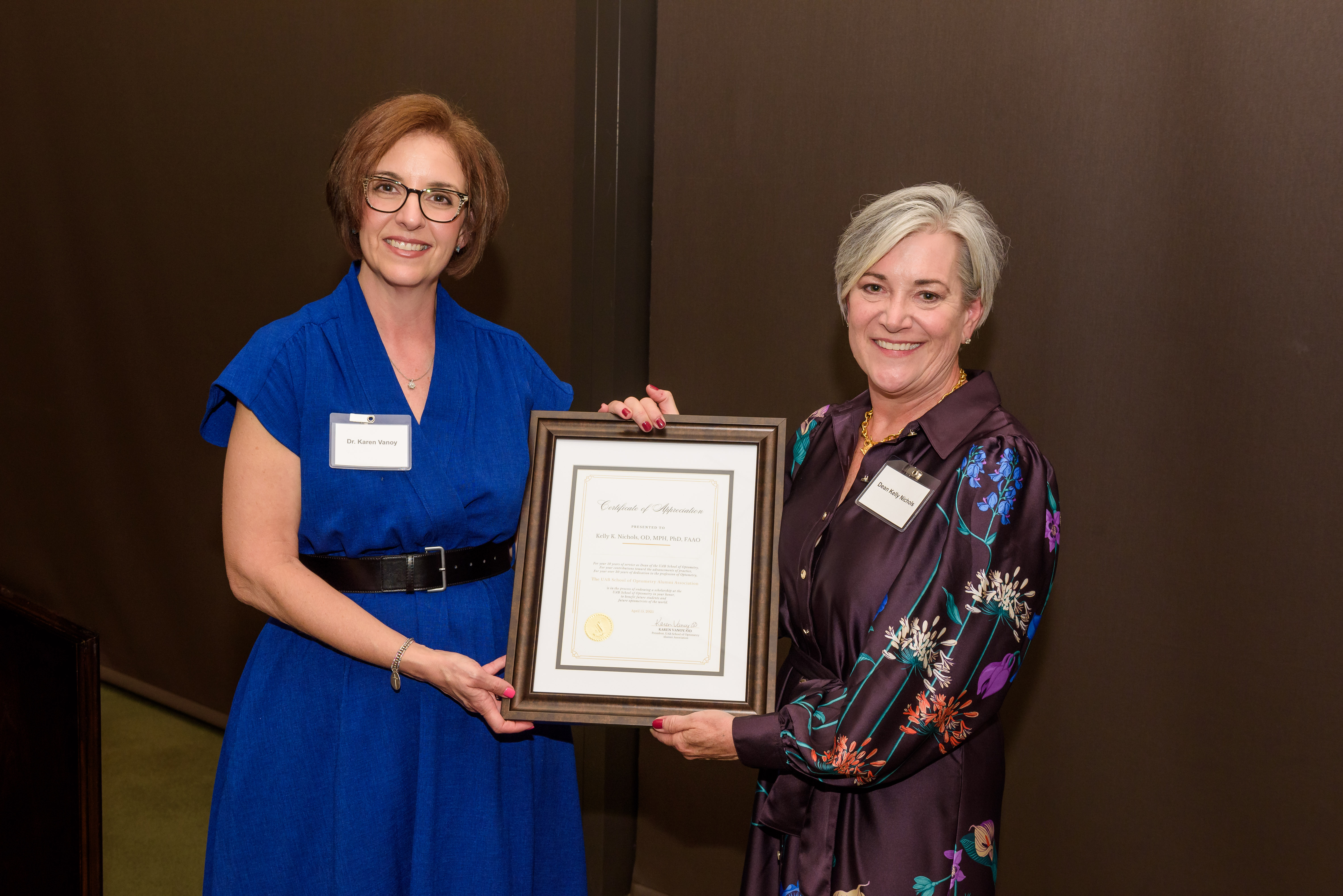 An evening of celebration turned into a moment of heartfelt surprise for Dean Kelly Nichols at the UAB School of Optometry’s annual Scholarship Dinner, when the Alumni Association announced the creation of a new endowed scholarship in her name.