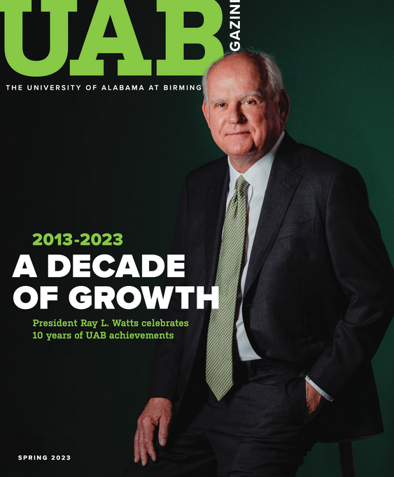 Ray L. Watts, M.D., a Birmingham native and graduate of UAB School of Engineering, was named UAB’s seventh president in 2013 and is now the university’s longest-serving president. Dr. Watts has led, with campus- and community-wide collaboration, development of UAB's most comprehensive-ever strategic plans—Forging the Future (2018-2023) and the current Forging Ahead (2024-2028)—as well as the current Research Strategic Initiative that is helping accelerate the pace of discovery and maximize the impact of UAB research on people’s lives locally and globally.