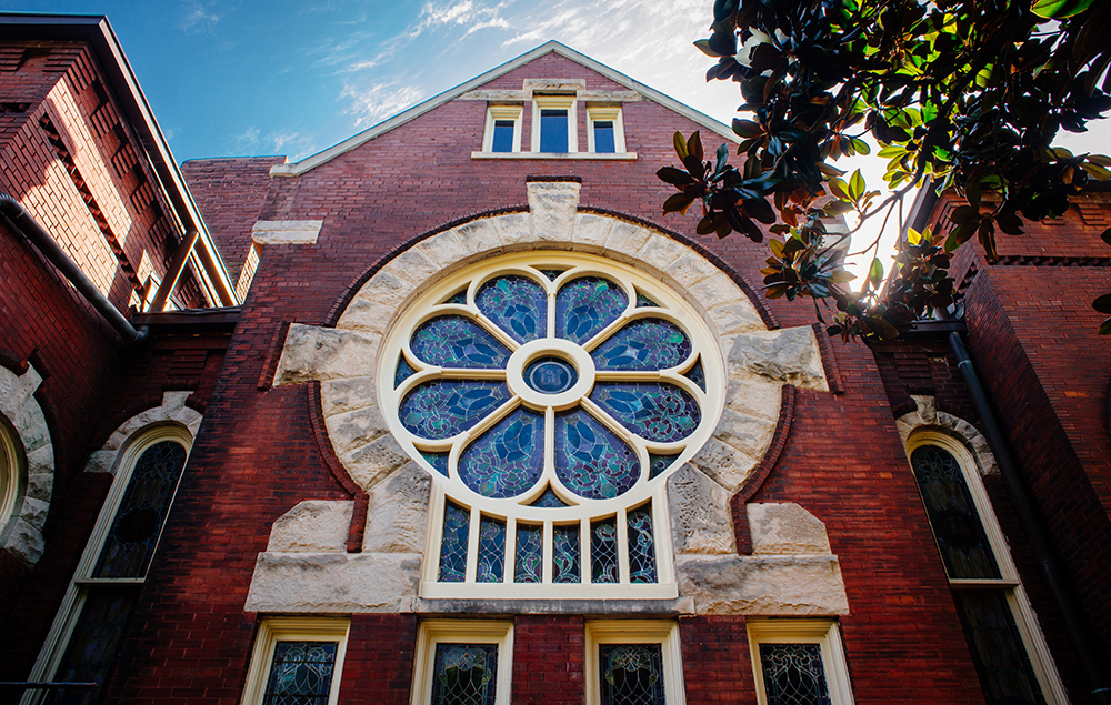 Throughout the building’s many changes, watching over it all were the building’s stained-glass windows. Original to the 119-year-old building, each of the three windows is arranged in the flower-like shape of a sewing bobbin colorized with panes of predominantly red, orange, green and gold glass. The windows are one of UAB’s most recognizable features, even inspiring Vaughan Randall’s 2006 sculpture “Rosette Bobbin,” which sits in the building’s east yard.