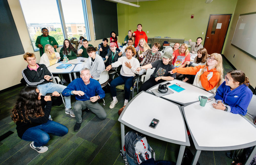 The goal was “to construct a class for first-semester freshmen that was low-pressure, to provide an escape valve,” Fontaine said. “The students are undergoing so many transitions and adjustments. These days anxiety/depression and suicidal ideation are rampant among college students. My goal was to give them an outlet to talk and share and to use laughter to help cope. Finding the humor in life is a great way to deal with the stresses we all face and likely provides many mental and physical health benefits. I do not envy young people, especially in this age of social media where everything and everyone is under the microscope. It troubles me greatly that they are under such pressure to make an impression, to fit in, to be accepted. I told my current class, ‘Don’t worry about having to make an impression — don’t drink the Kool Aid.’” He also talks to the students about developing their own happiness plan.